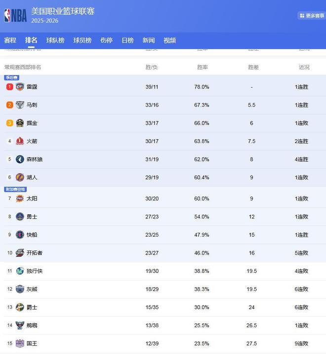 西部最新排名;