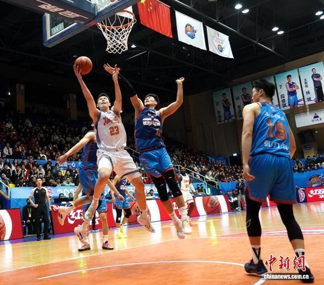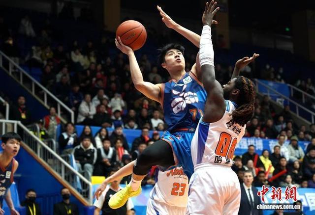 四川男籃隊員景菡一(藍衣)得到全隊最高的14分,在比分落後時扛起瞭球隊進攻重任。記者 呂楊攝