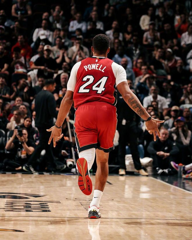今年,他終於抓住瞭機會。本賽季轉戰熱火後,鮑威爾徹底迎來爆發,首發出戰 43 場比賽,場均出戰 30.7 分鐘,能砍下 23 分 3.7 籃板 2.6 助攻 1.2 搶斷,三項命中率穩定在 47.2%、39.2%、84.4%。場均得分和籃板,都是他職業生涯的最高紀錄,場均助攻也排在生涯第二高,這樣的穩定輸出,終於讓聯盟看到瞭這位 “綠葉球員” 的實力,也讓他熬過瞭 11 年的漫長等待,首次站上全明星的舞臺。