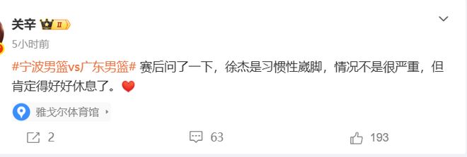 徐傑再一次傷到瞭腳踝,據賽後跟隊記者關辛的報道,關師傅確認瞭徐傑的傷病情況——習慣性崴腳,情況不是很嚴重,但肯定得好好休息瞭。