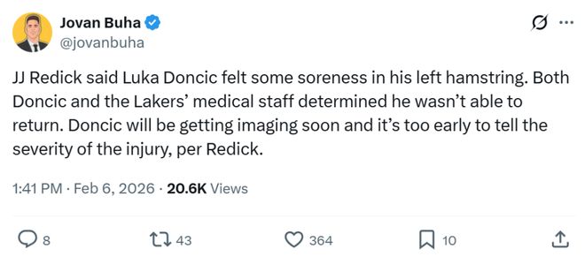 賽後湖人主帥雷迪克被問到相關問題,他表示東契奇左腿筋有些酸痛,他與球隊醫療團隊一致認為東契奇無法重返賽場。