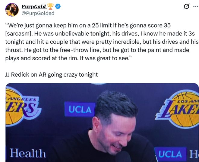 面對裡夫斯這樣的表現,賽後雷迪克自然不吝嗇溢美之詞:“裡夫斯本場的表現無可挑剔,如果他總是能夠拿下35分鐘,我以後就將他的登場時間控制在25分鐘,他的表現簡直不可思議,命中瞭幾記漂亮的神仙投射,但突破與沖擊力才是關鍵所在,不僅能夠站上罰球線,還能組織串聯為隊友創造機會,看到他這樣的表現感覺真是太棒瞭。”