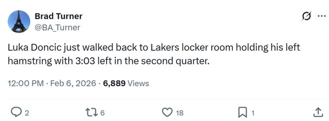 湖人雖然拿下勝利,但核心東契奇因傷退場,在第二節一次進攻回合後,東契奇捂著自己的小腿退場,期間還踢瞭一下場邊的廣告牌看起來十分沮喪,隊記Brad Turner跟進曝出東契奇是左腿筋受傷。