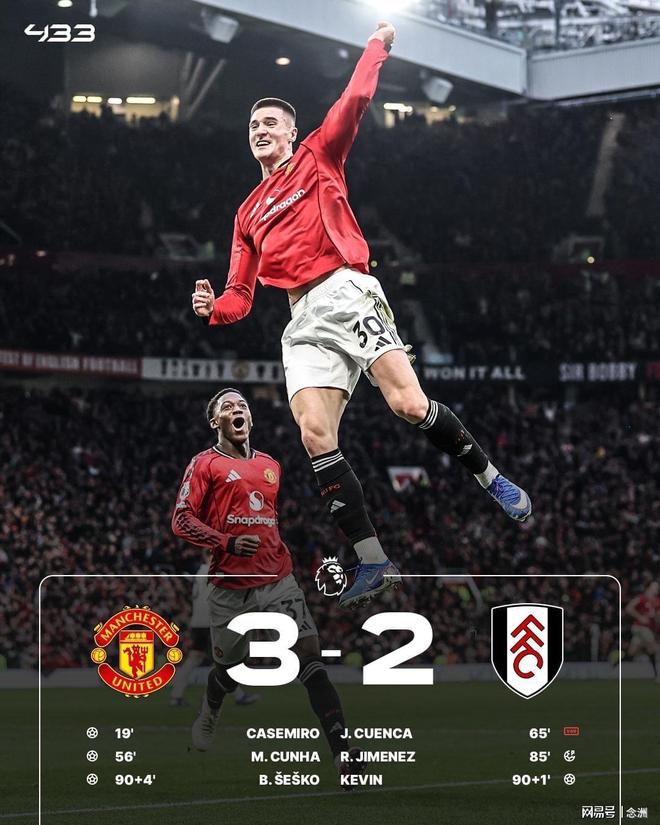 英超第24轮,曼联主场3-2绝杀富勒姆,三连胜升第4。库尼亚造点被改判,B费助攻卡塞米罗头球破门首开纪录,卡塞米罗助攻库尼亚抽射扩大比分,谢什科替补中柱,马奎尔送点,希门尼斯点射扳回一城,凯文世界波扳平比分,B费助攻谢什科抽射完成绝杀。