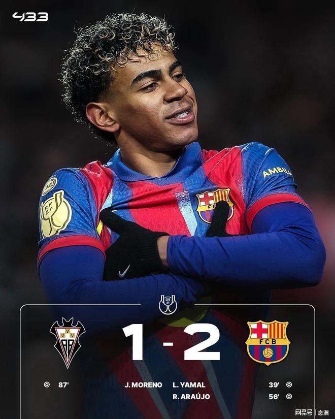 国王杯1/4决赛,巴萨客场2-1战胜阿尔瓦塞特,晋级国王杯四强,取得各项赛事5连胜。亚马尔连场破门,德容助攻,阿劳霍收获回归首球,拉什福德角球助攻,哈维-莫雷诺扳回一城。