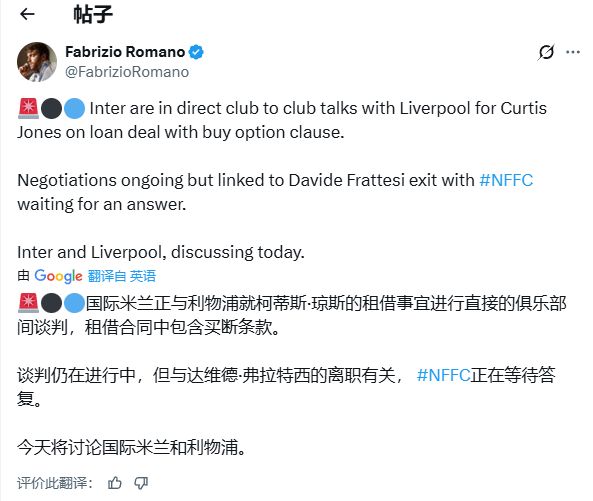 羅馬諾在X(推特)上表示:“國際米蘭正與利物浦就柯蒂斯·瓊斯的租借交易進行瞭俱樂部層面談判,該交易包含購買選擇權條款。談判正在進行中,但與弗拉泰西的離隊相關,諾丁漢森林正在等待答復。”