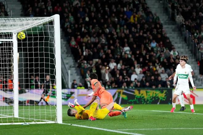 此役,巴萨派出了亚马尔、费兰托雷斯和拉菲尼亚的进攻三叉戟。开场6分钟,奥尔莫精准直塞,亚马尔单刀赴会晃过门将打门得手,巴萨客场1-0领先。第28分钟,奥尔莫打门击中横梁。随后埃尔切发起进攻,阿尔瓦罗-罗德里格斯反越位成功单刀破门扳平比分。第34分钟,费兰托雷斯射门击中横梁,随后他的补射再度被门框拒绝。第41分钟,德容冷静回做,这一次费兰托雷斯没有错过机会,他的推射敲开了埃尔切的球门,巴萨再度反超并半场2-1领先。