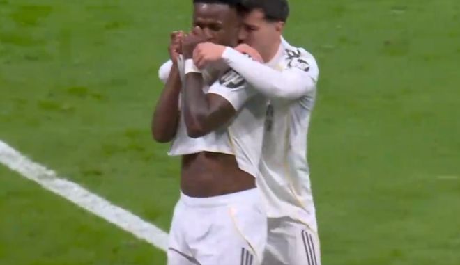 第15分钟,维尼修斯左路得球内切,面对三名后卫的逼抢,维尼修斯右脚劲射,球击中横梁之后反弹入网。进球之后,维尼修斯多次亲吻队徽,并且示意皇马球迷加油。
