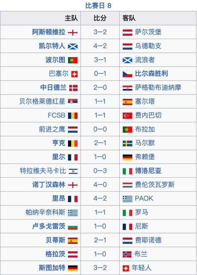 欧联杯联赛阶段第8轮赛果
