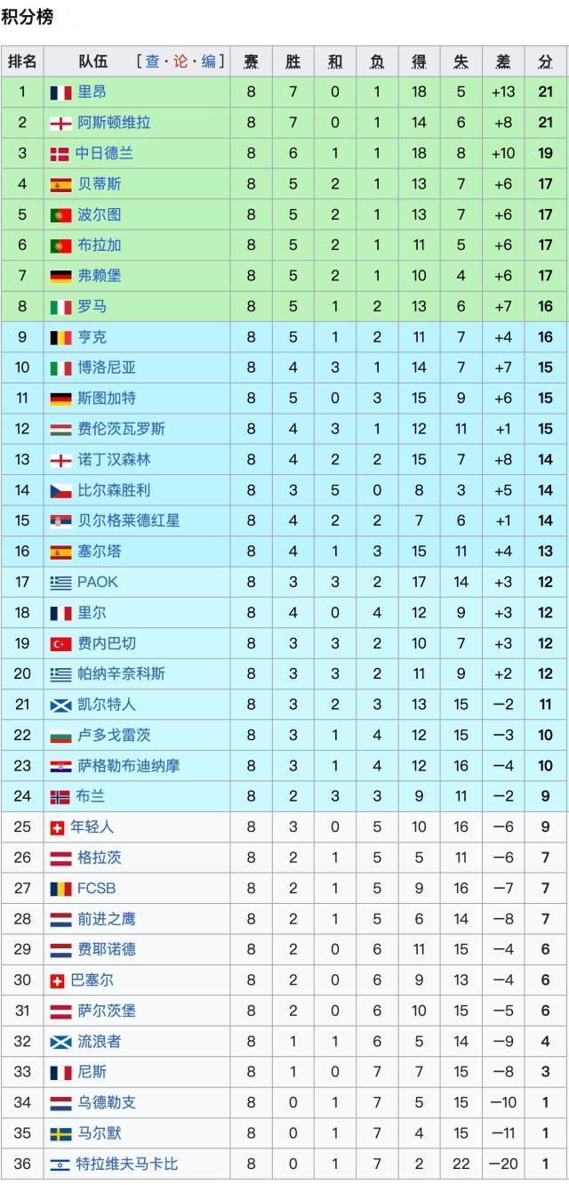 欧联杯联赛阶段最终积分榜