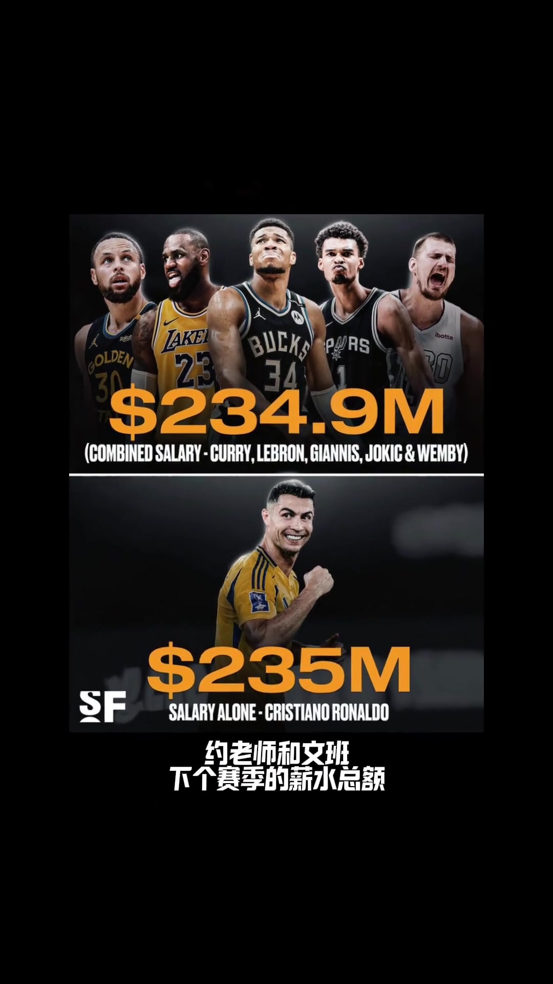 詹姆斯库里字母约老师文班下个赛季的薪水总额不及 C罗一人