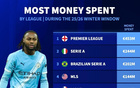 德转列2026年冬窗联赛支出榜:英超4.53亿欧断档第1,意甲第2