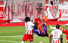 刺激!前后夹击下法甲球员惊天倒勾 进球后拒绝庆祝