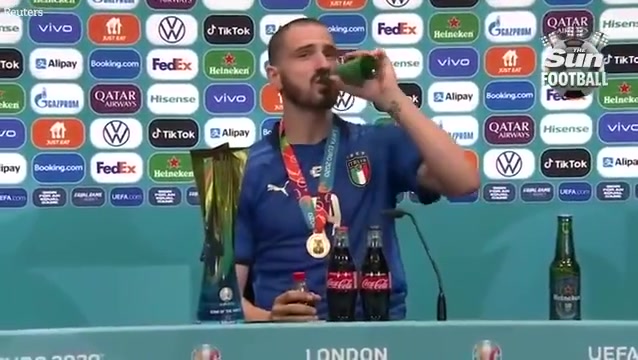 太搞了名场面意大利夺冠博努奇发布会狂喝啤酒和可乐