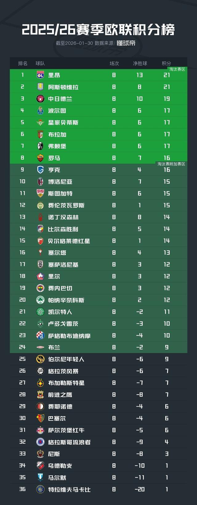 欧联积分榜:里昂、维拉、贝蒂斯、弗赖堡、罗马晋级16强
