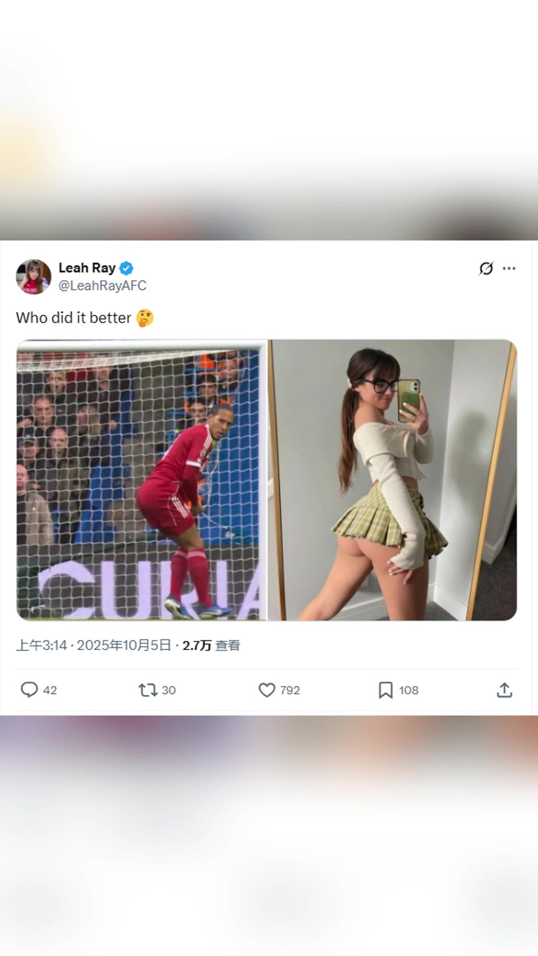 阿森纳成人女博主嘲讽范迪克谁做得更好