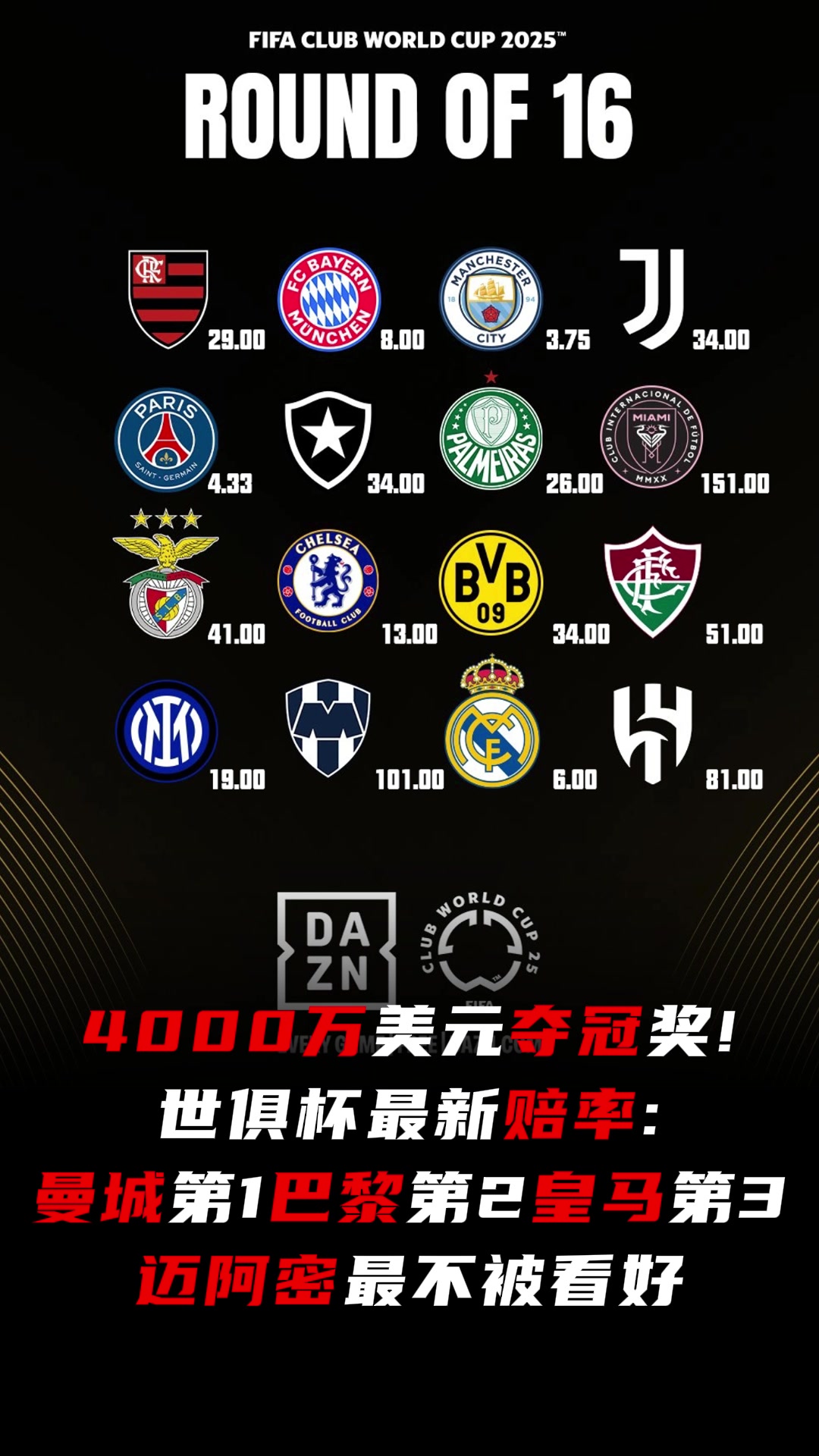 看好谁世俱杯最新夺冠赔率曼城第1皇马第3迈阿密国际最低