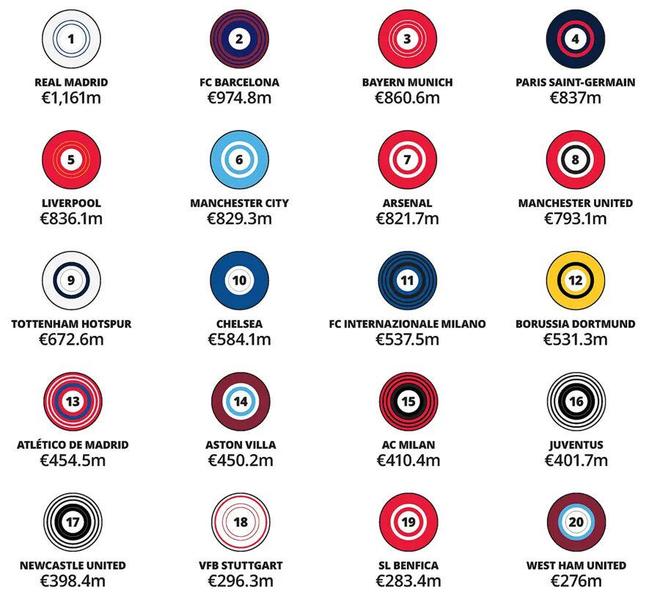 2026全球收入最高的30大足球俱乐部,皇家马德里、巴塞罗那、拜仁慕尼黑排名前三