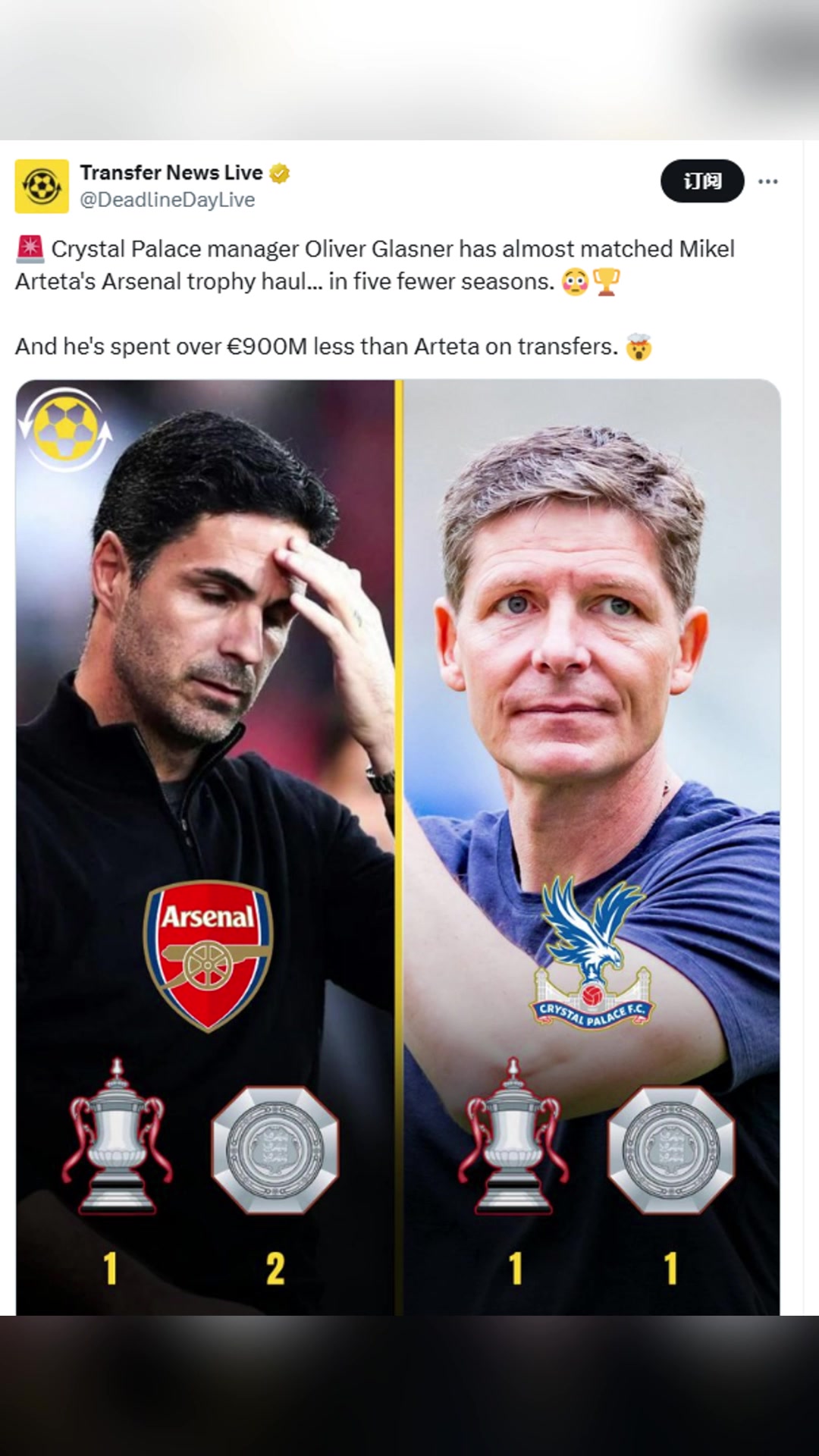 博主水晶宫主帅几乎追平了塔子的奖杯数转会费少了9亿多欧